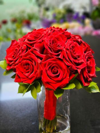 A classy, alluring bridal bouquet made with white colour roses, white lysianthus and solidaster, symbolizing pure love and respect towards fellowship and new beginning. This delicate arrangement of flowers represents the start of a new chapter filled with fellowship and joy. This bridal bouquet is perfect for those brides who wants to add a classic touch. Grand size shown in image.
